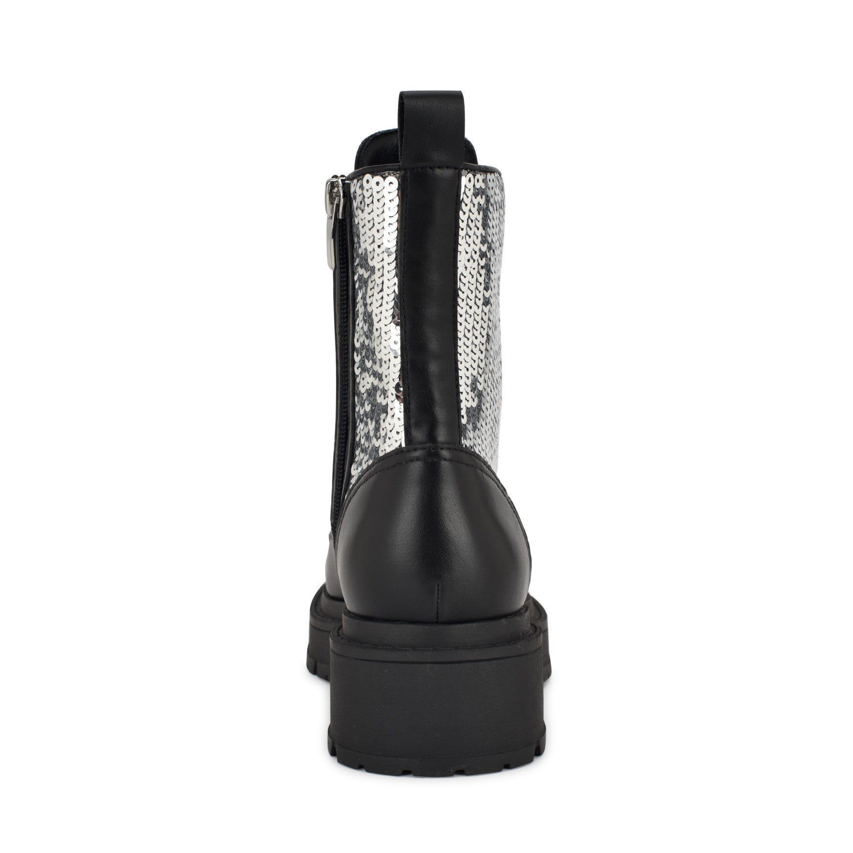 Sequin panels and a lug sole walk into a bar, and the Hediy is what happens next. This lace-up combat bootie brings the sparkle without losing its edge, featuring a round toe, rubber block heel, and a mid-height shaft covered in tonal sequins that catch light from every angle. Statement-making and grounded all at once, it's the boot that does the most while keeping you on your feet all night.