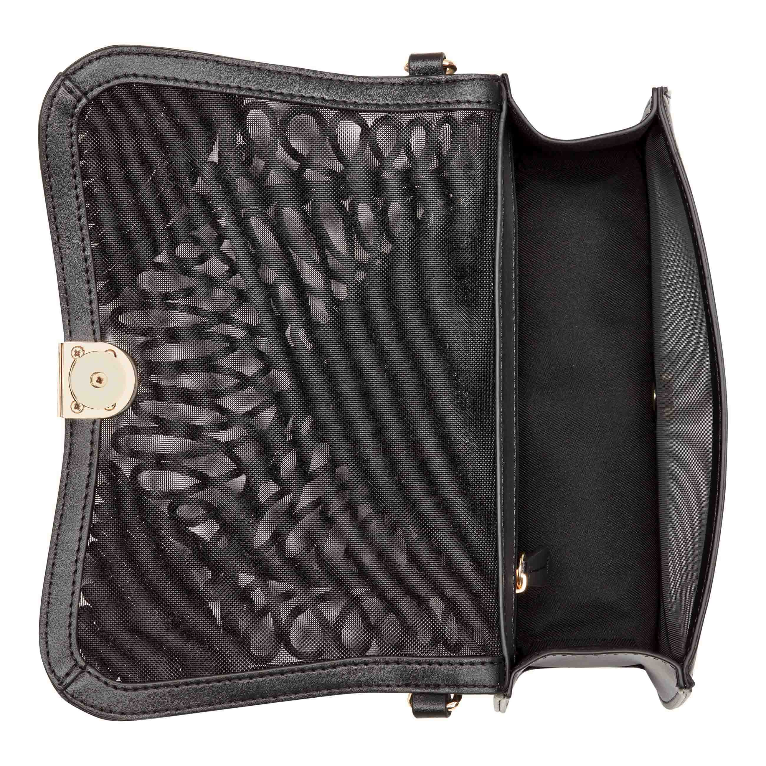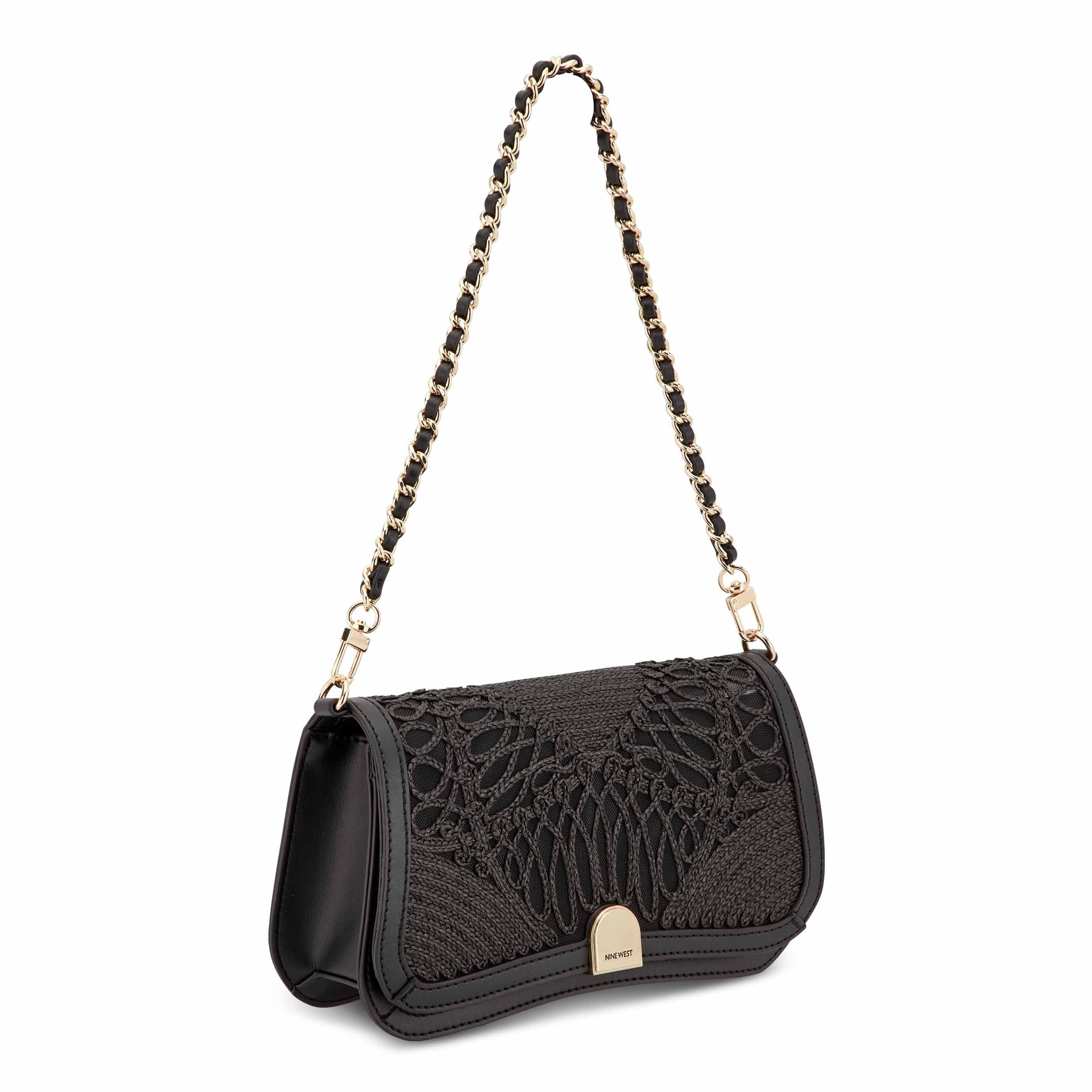 Nine West designer Somi flap chain shoulder bag that converts to a clutch when sliding the chain strap inside. Perfect for all special occasions with the crochet and mesh design accents and matches back to your Nine West shoe. Perfect for special event or just a beautiful show stopper.