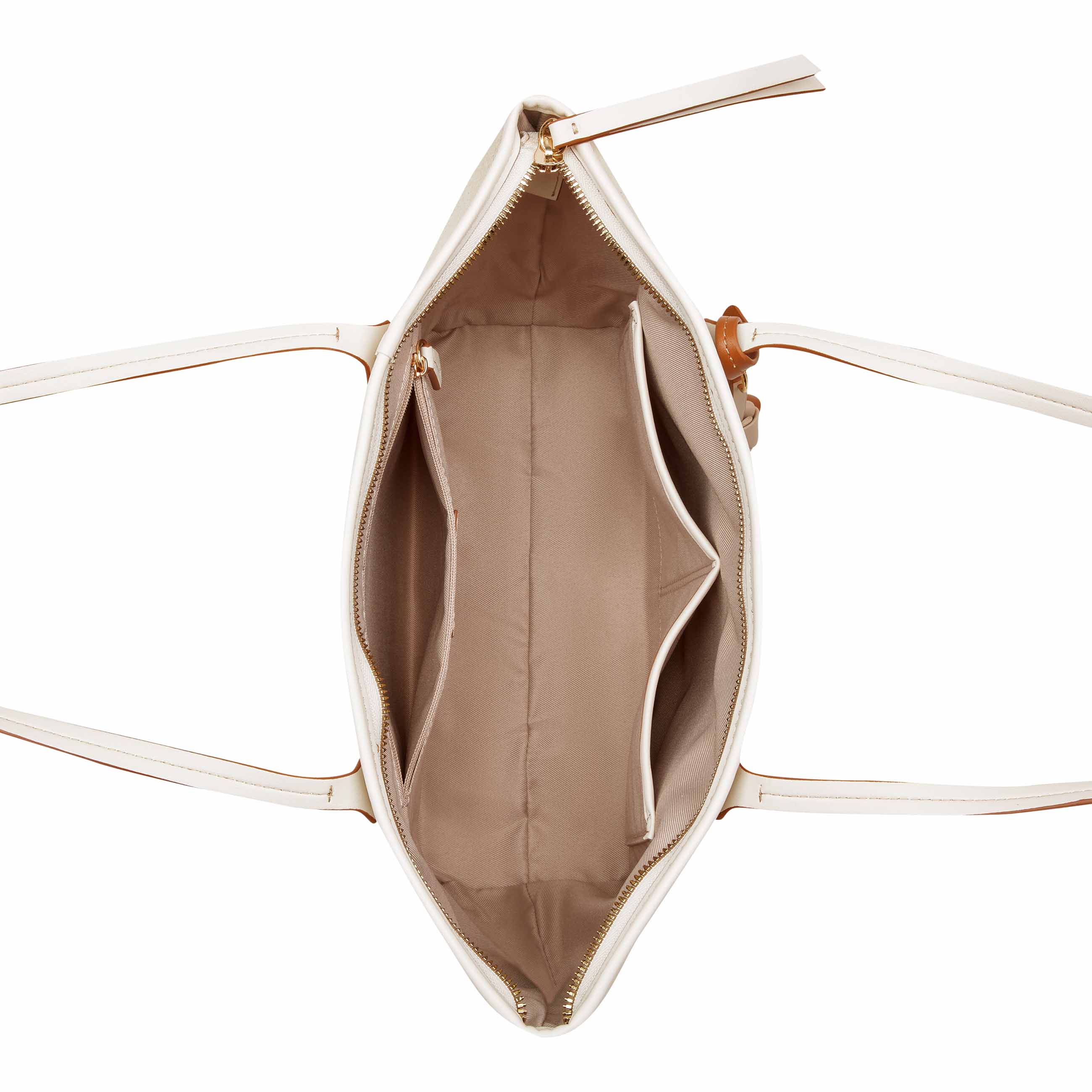 Nine West designer Talley shopper. Designed in beautiful canvas material which elevates your spring and summer look with floral pop adornment. Hardware and elevated branding with internal organization and full zipper closure