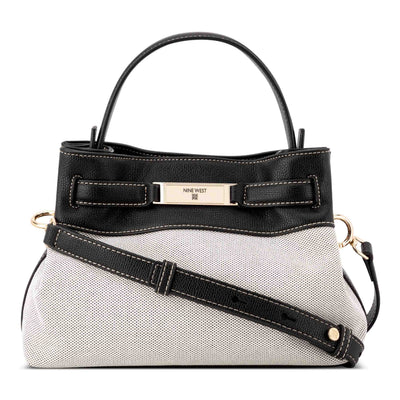 Nine West designer satchel bag with internal slip and zipper pocket organization and external hardware details and branding. Designed with buckle details and luxe materials, converts from handheld satchel to crossbody