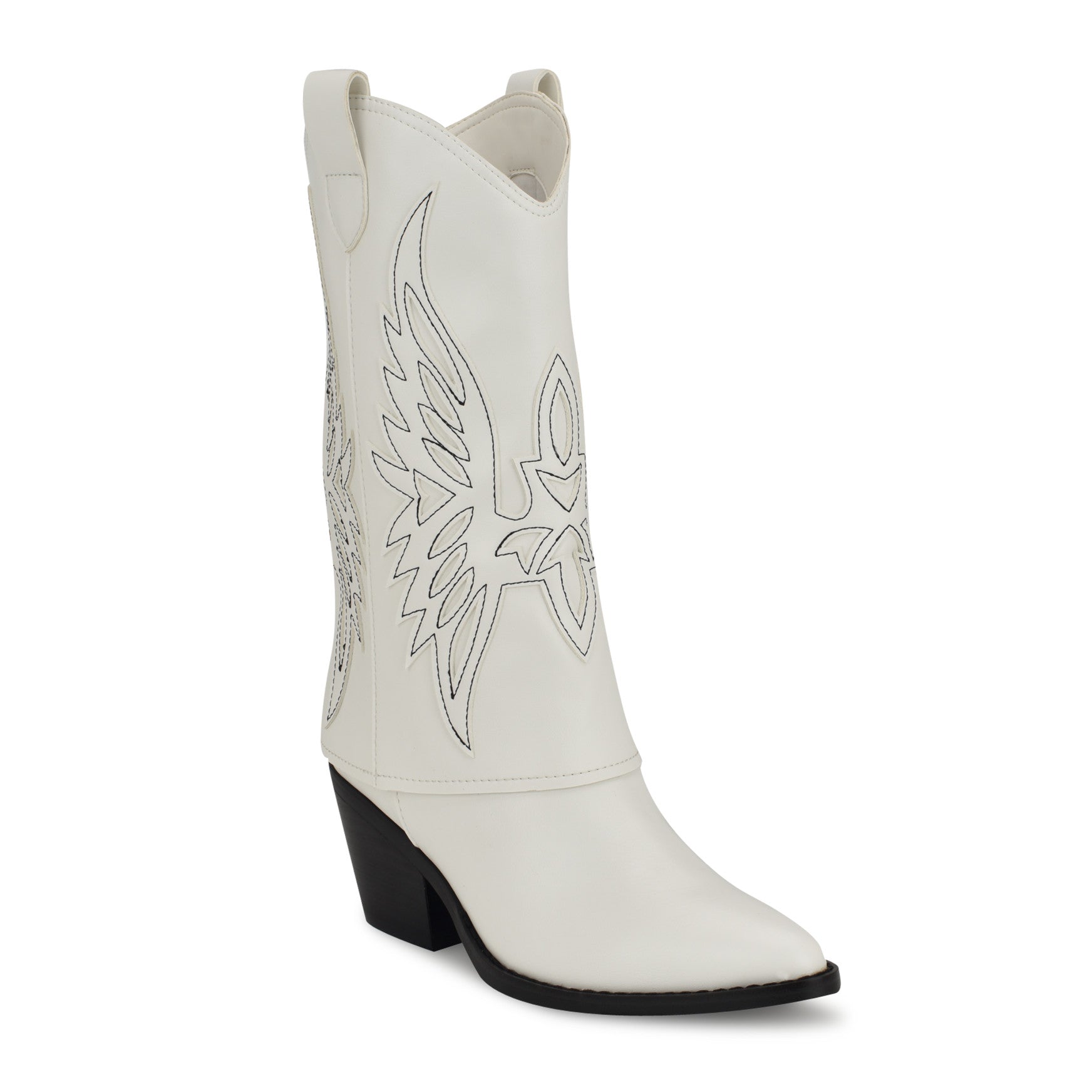 The Ringer is a mid-calf western boot with bold wing-shaped overlay detailing, a pointed toe, and a stacked block heel that keeps you grounded all day. Pull tabs at the top, raw-edge construction at the shaft, and that unmistakable cowboy silhouette give it real personality without trying too hard. Materials vary by color.